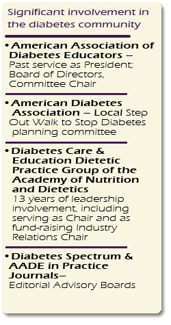 Tami received her Bachelor of Science Degree from the University of Kentucky and has over 25 years experience providing diabetes and nutrition education in a variety of settings. In addition to her thriving consulting career, Tami counsels individuals seeking nutrition guidance and diabetes education through her practice in Lexington, KY. She is recent Past President of the American Association of Diabetes Educators, and was 2008 Diabetes Educator of the Year of the Academy of Nutrition and Dietetics' Diabetes Care & Education dietetic practice group. |